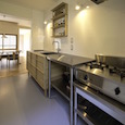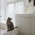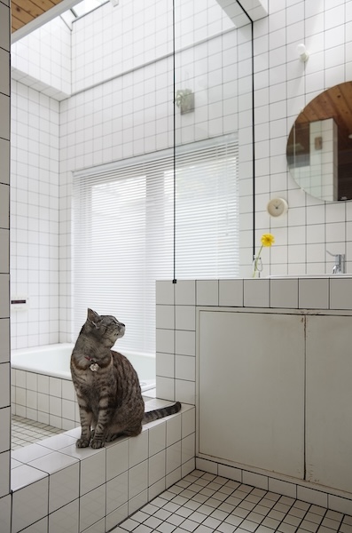 築60年の木造平屋のリノベ。既存の平面に斜めに木の壁を作り一部天井を勾配天井として空間に変化をつけました。猫間障子から差し込む柔らかい光。黒板としても使えるグレーの壁。壁に小さく設けられた愛猫用通路。家具的なキッチンと業務用キッチンの組み合わせなど多くの工夫が盛り込まれた家となりました。(photo:新 良太)