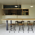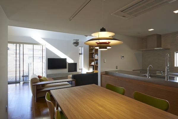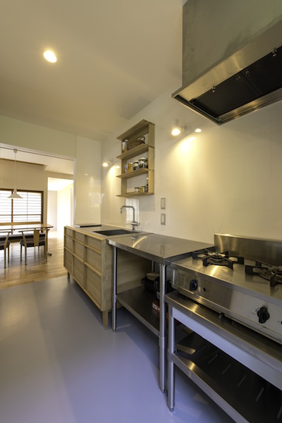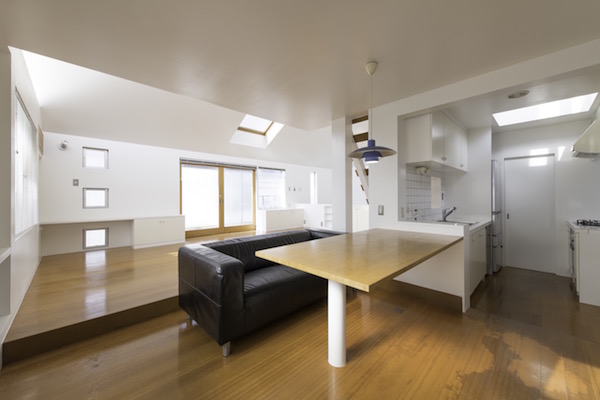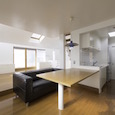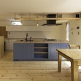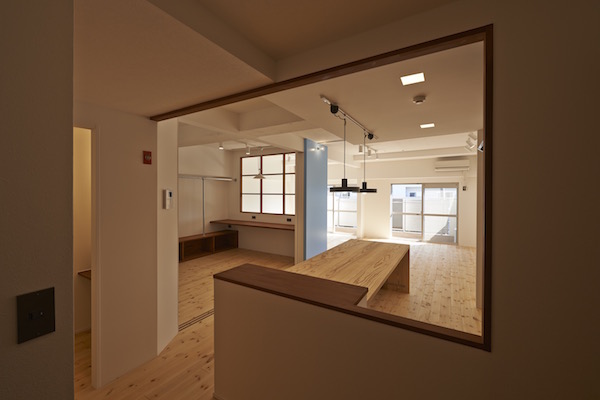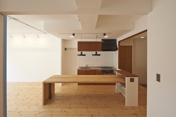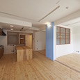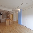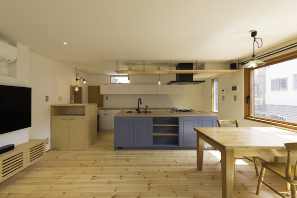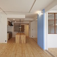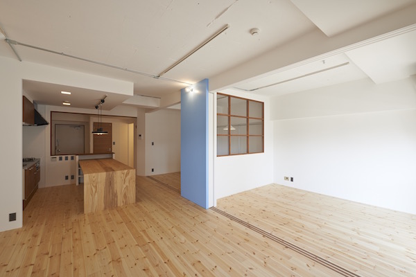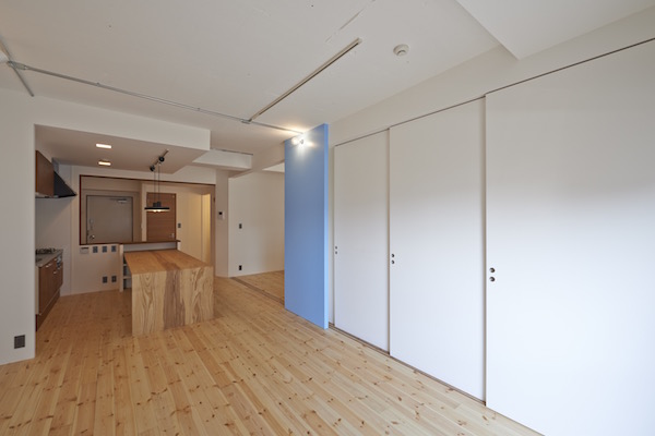 既存間仕切りを解体し大きなワンルームとし、家族全員が楽しく暮らせる場所を作るということを考えました。部屋の中心には3メートル近くある大きなテーブルがあります。また、黒板塗料を塗った青い壁、両親や友人が泊まりに来た時に間仕切ることが出来る可動式壁など、楽しい仕掛けがいっぱいの家です。(photo:新 良太)