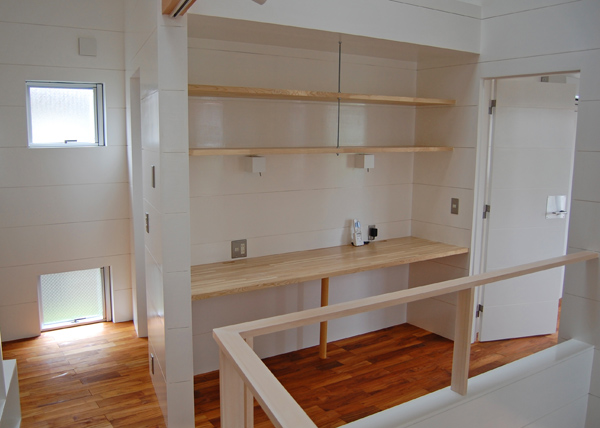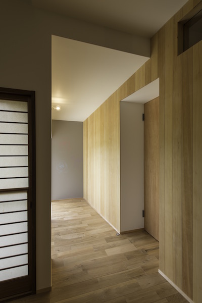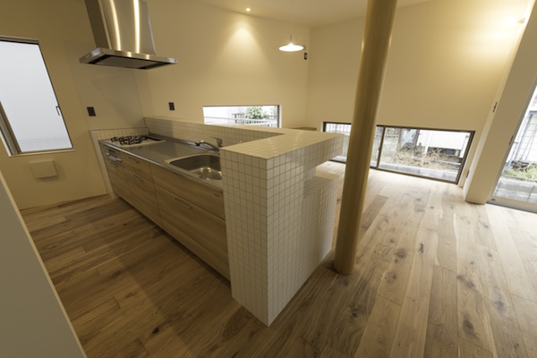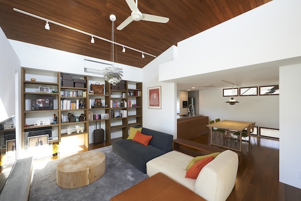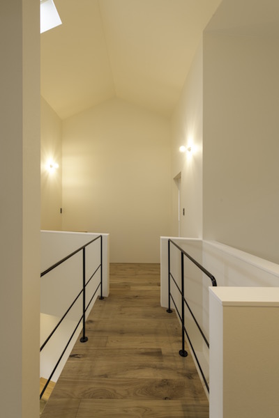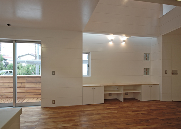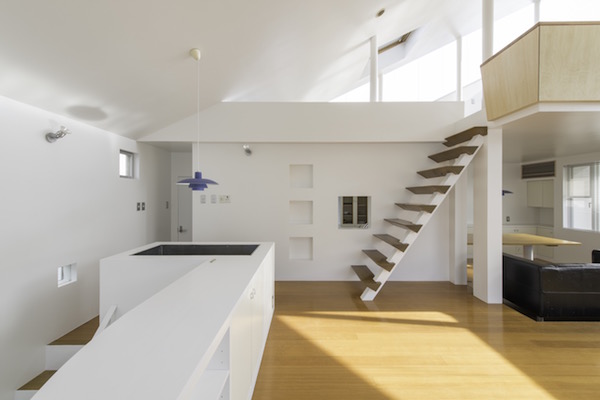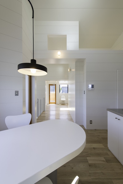 1階にLDK、2階部分に個室と水回りを配置しています。各個室へはLDKの上部にある吹き抜けに面した廊下を通り、また父親の書斎も2階の吹き抜けの一部にありますのでいつでも家族の気配が感じられるプランとなっています。車2台が収納できるビルトインガレージから直接玄関へ行けますので雨の日も濡れずに部屋へ入れます。(photo:新 良太)