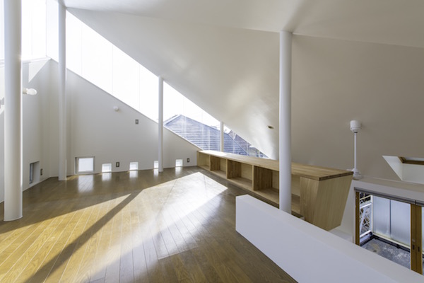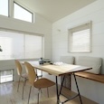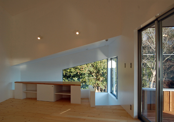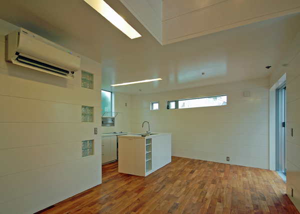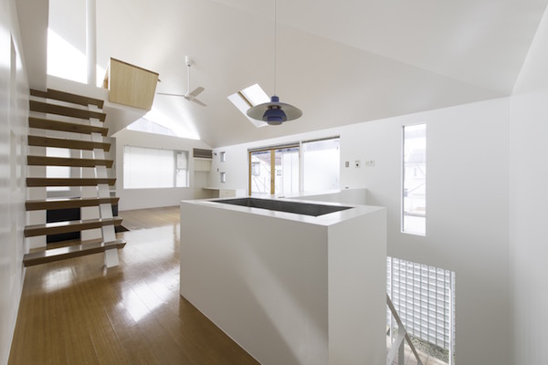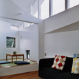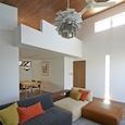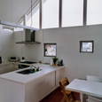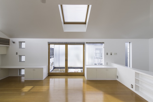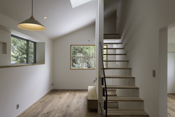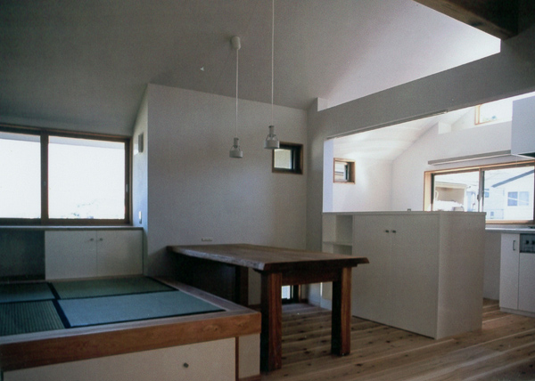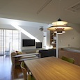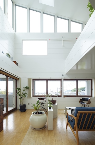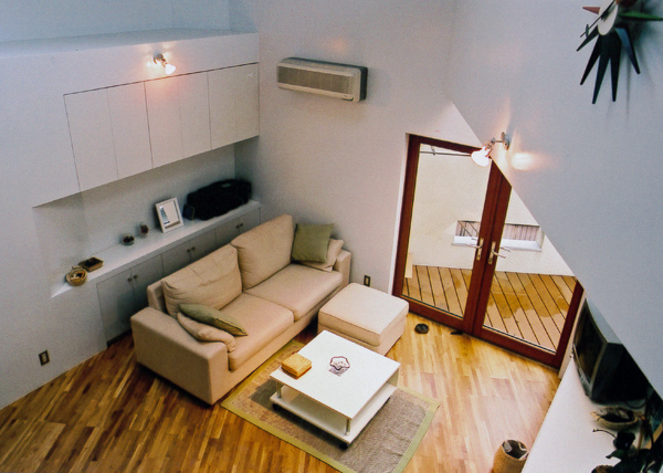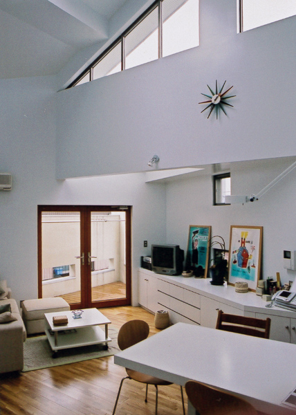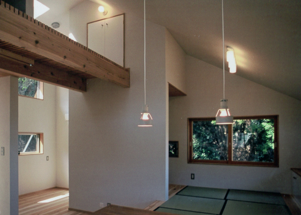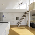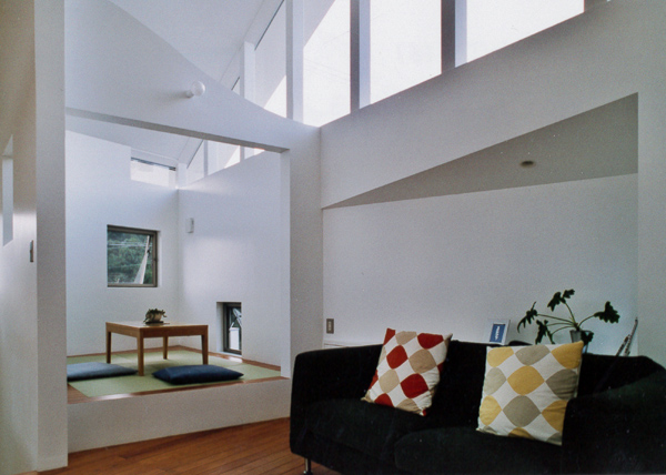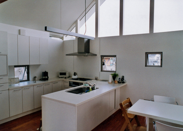 建築家の自邸です。空調設備がないこの家は、窓の位置を工夫することにより自然の風を最大限取り込むように計画してあります。また、ハイサイドライトや大きな吹き抜けにより、開放感あふれる空間となっています。