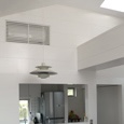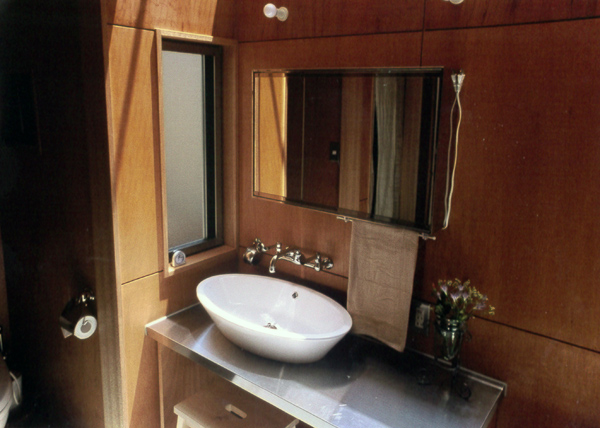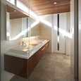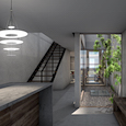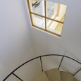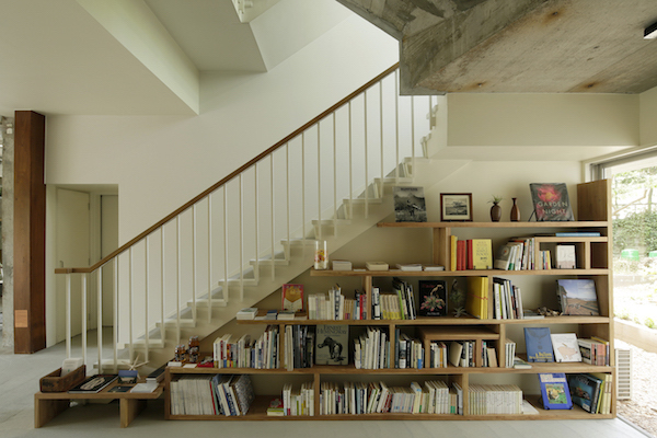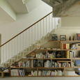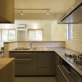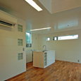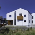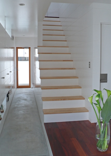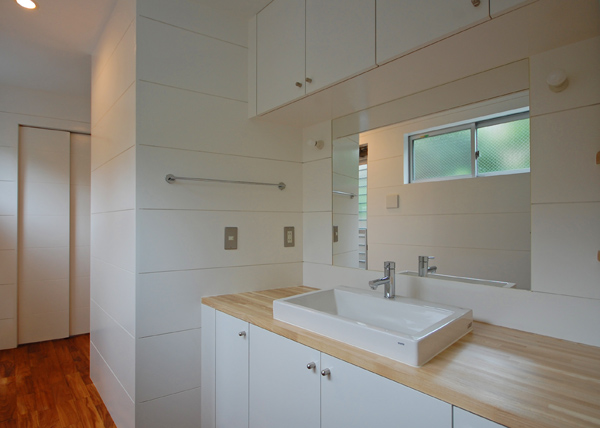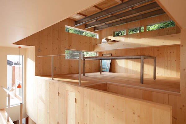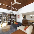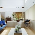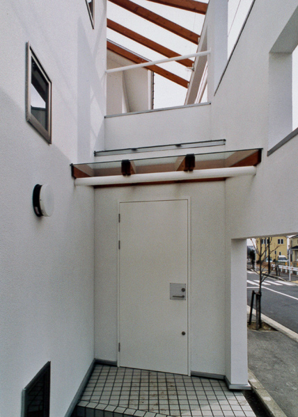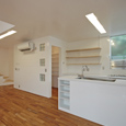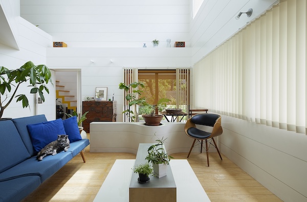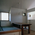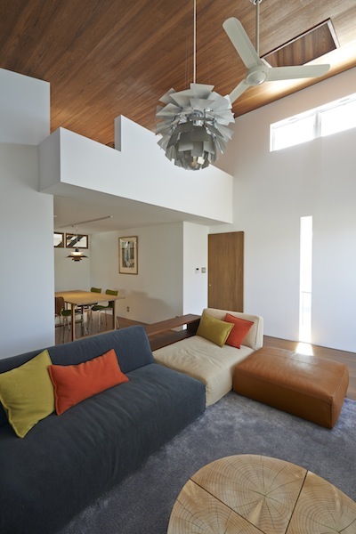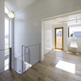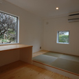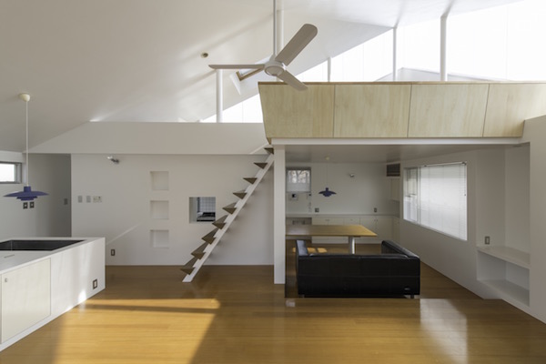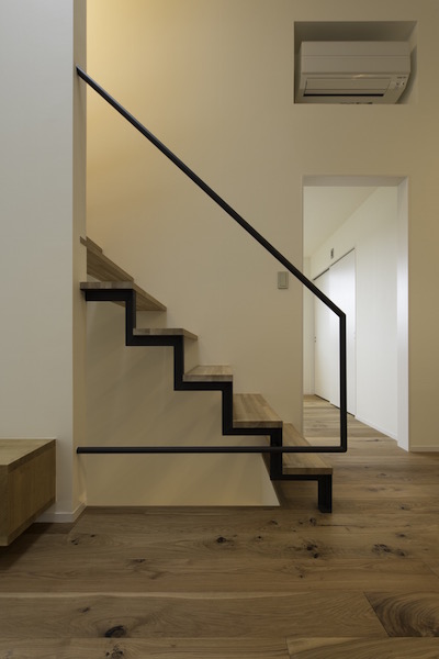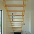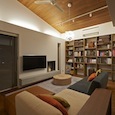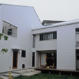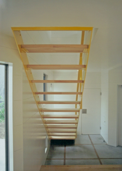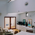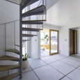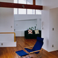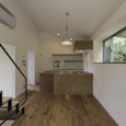 建築家の自邸です。空調設備がないこの家は、窓の位置を工夫することにより自然の風を最大限取り込むように計画してあります。また、ハイサイドライトや大きな吹き抜けにより、開放感あふれる空間となっています。