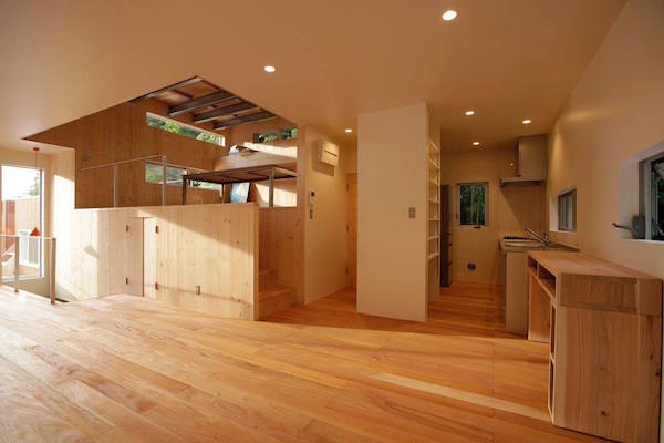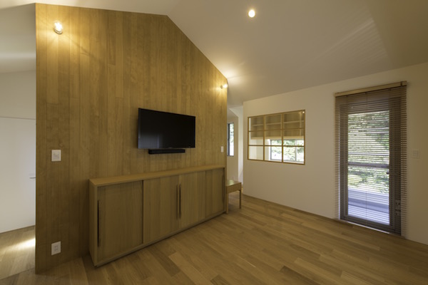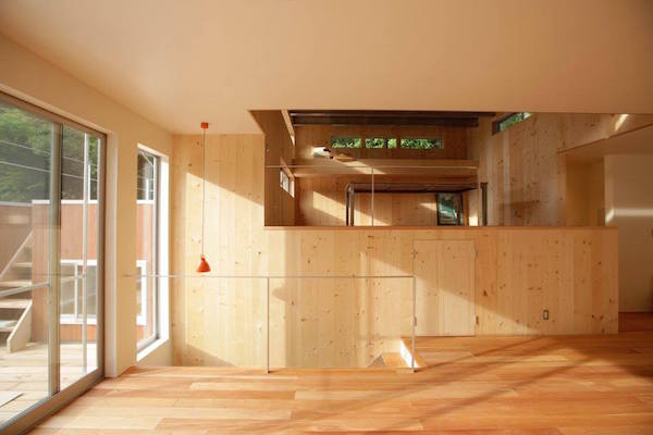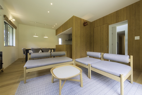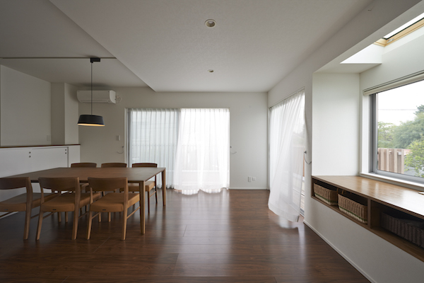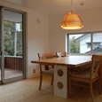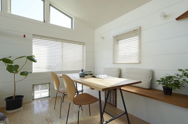 周りは沢山の木があり、まるで森の中に建っているような家です。室内も自然素材を多く使用し、ダイニングの一部に小上がりを作り、畳の上でゴロンと寝っ転がりながら外の景色を楽しめます。