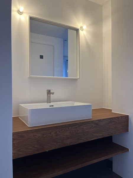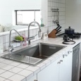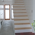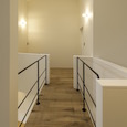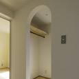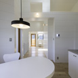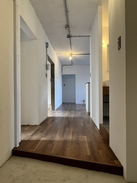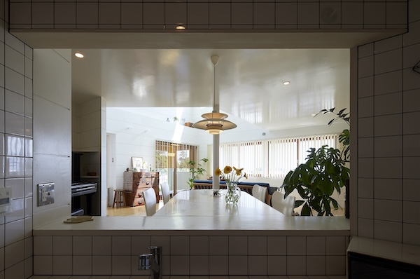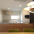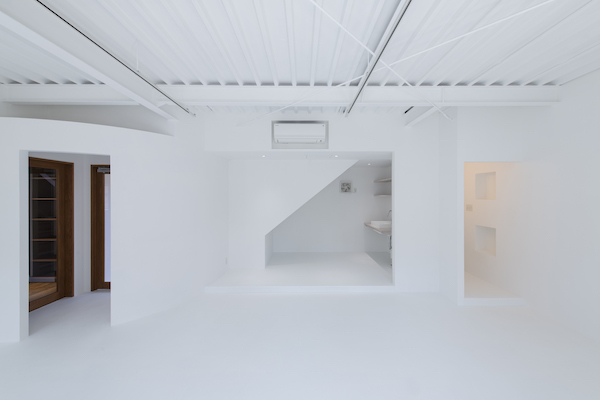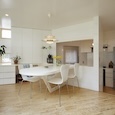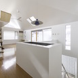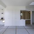 築50年を超える団地の最上階住戸のリノベーション。既存の仕上げを剥がし、コンクリートの素地と白い塗装、露出した設備によって空間を整えました。最小限の操作にとどめることで、団地の中に浮かぶような余白と、これからの暮らしを受け止める場をつくっています。