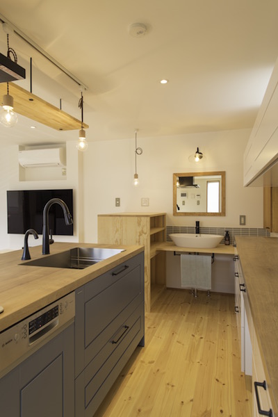 ご夫婦とも料理をするお宅ですので、アイランドキッチンやパントリーに回遊性を持たせ、家族で料理を作っていても動線がぶつからないよう工夫しています。また、趣味の自転車のための部屋が玄関から直接靴を脱がずにアプローチできるようにしました。