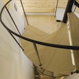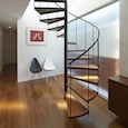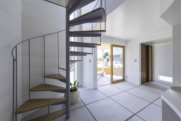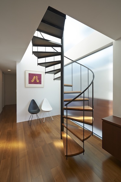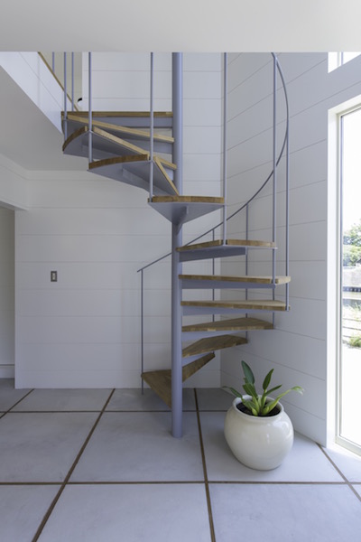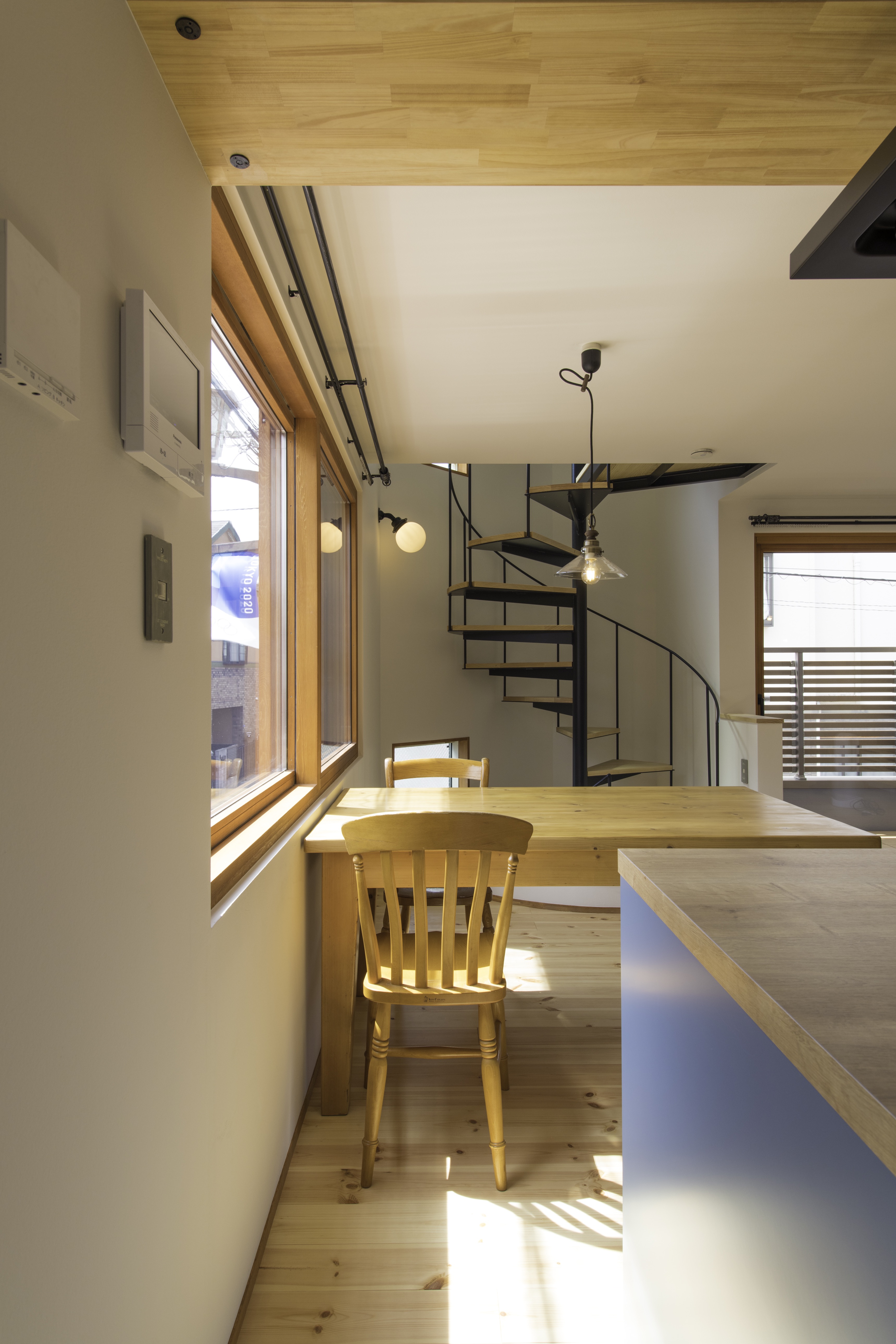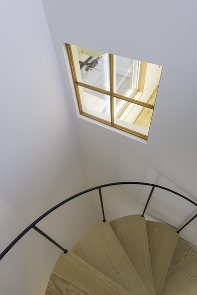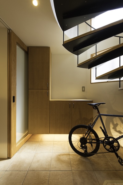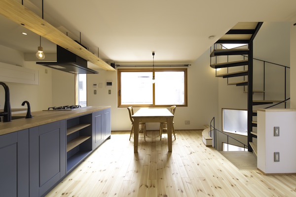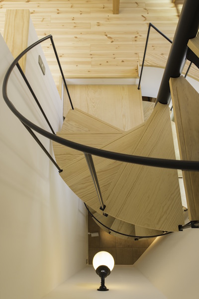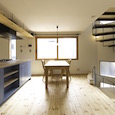 狭小地に建つ木造三階建て住宅です。準防火地域ですがLDKには木製建具を採用。1階と3階に水回りと個室を分散させLDKをできるだけ大きく取りました。螺旋階段が空間のアクセントになっています。(photo:新 良太)